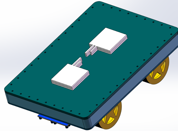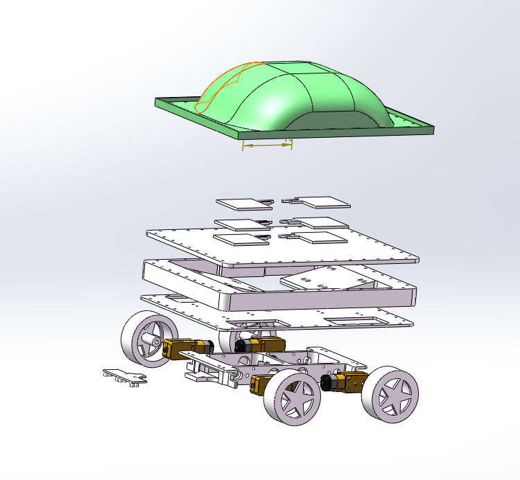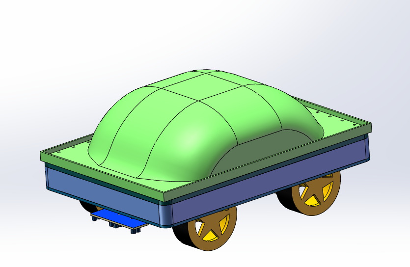 在设计上,下方放置小车控制主板,巡线传感器,电机及驱动轮。中间层放置结构电池,使用复合材料封装。上层设计为类龟壳结构,主要负责承压及分担压力。
