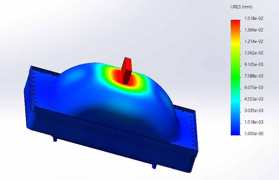 我们发现。在小车直接受压的情况下,小车上方中心的形变相比其他地方变化较大,且形变的范围小。说明我们的压力并没有较好地分担到小车的全身各结构上,在三点弯实验中,这有很大概率发生局部穿刺。