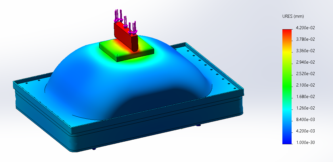 为了防止车身在三点弯实验中发生局部穿刺,我们在车身的顶部平面区域加装了一块PLA的加强片,使用AB胶将加强片与车身连接。该加强片可以较好地分担承受压力,将压力分担到更广的车身上,使得车身的受力面积增加,车身所受的压强减少,进而降低车身的形变程度。在仿真中我们可以看到,小车在加强片的作用下得以承受更大的压力与形变。