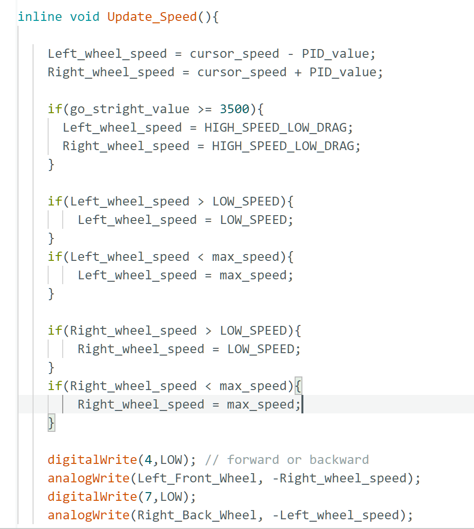 同时在转弯过程中,我们也看到由于小车整体的功率限制,小车出现了在一侧轮子全速后,另一侧轮子由于输出功率不足而动力不足的情况,但是我们的降速函数很好地起到了调节作用,使得小车最中得以平稳地通过曲线。