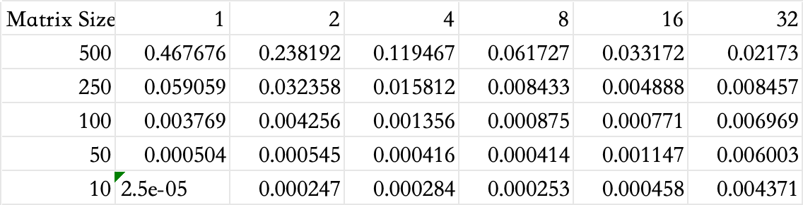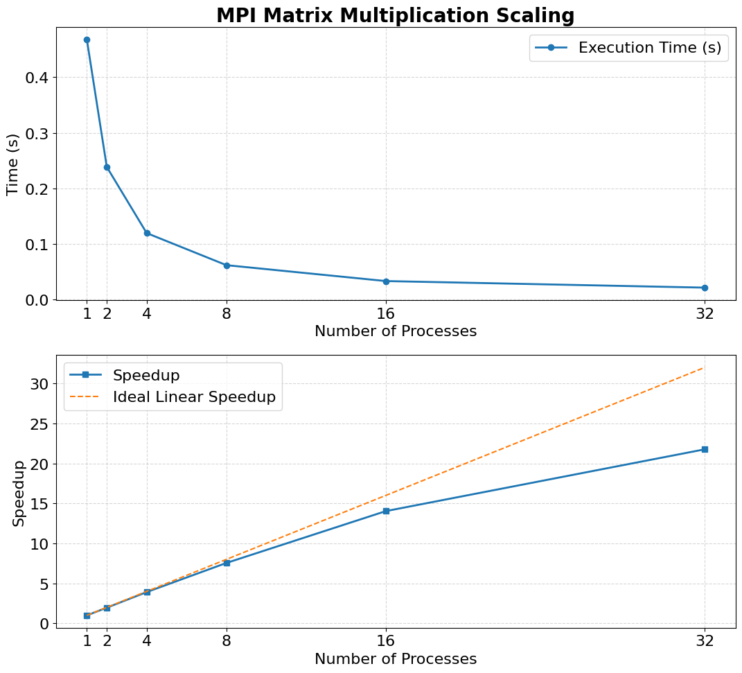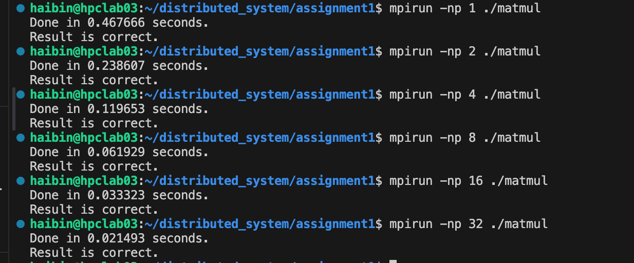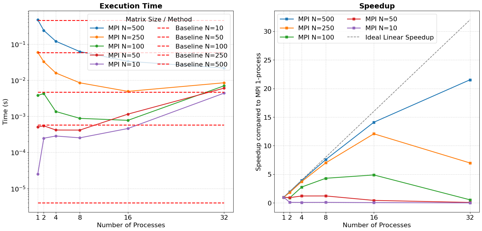 We run it locally with 1, 2, 4, 8, 16 and 32 processes with $N=500$ matrix size.