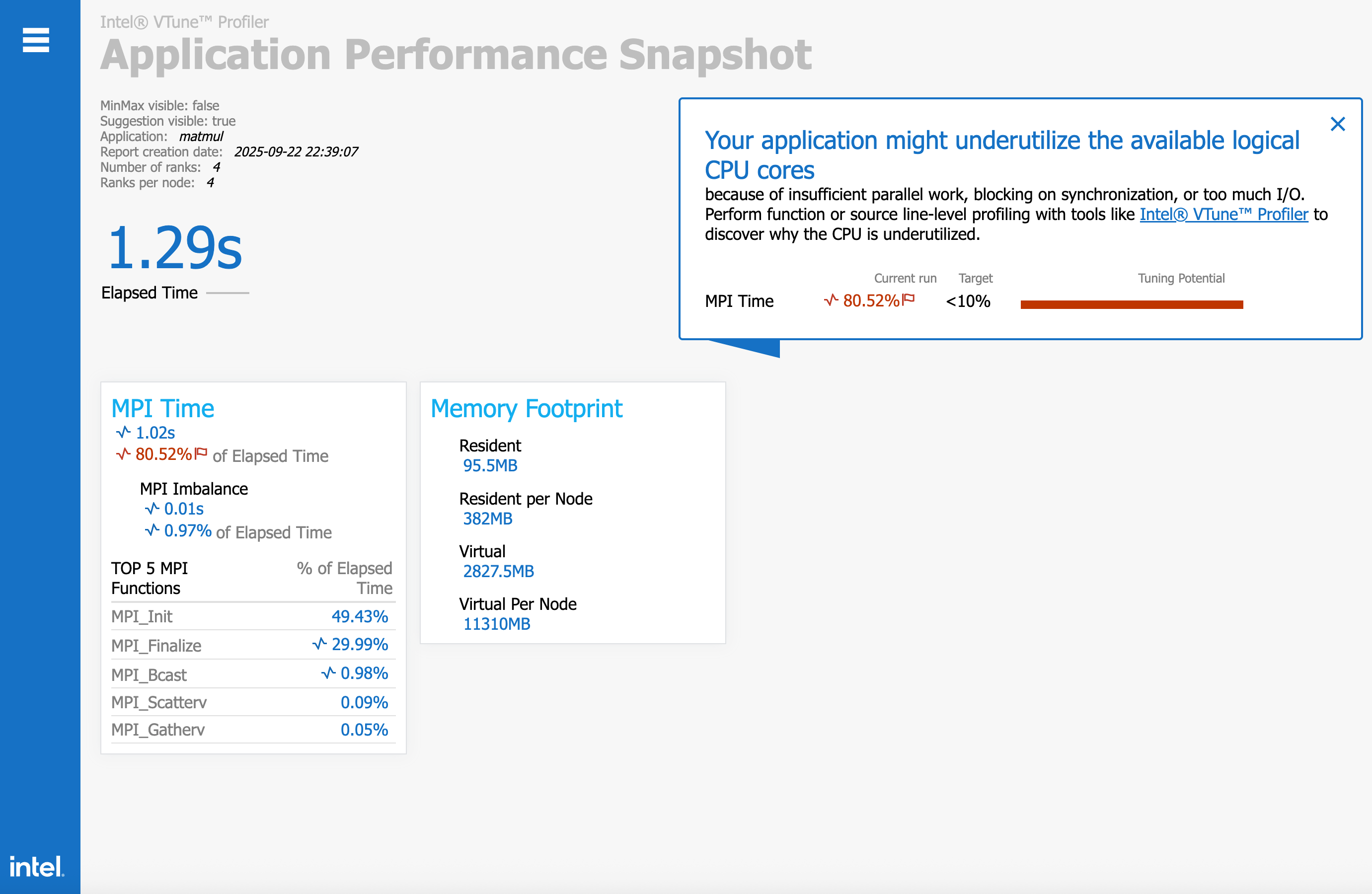 We can see that the whole program use 1.29s (from main function, matrix init to return 0), among MPI_Bcast, MPI_Scatterv, MPI_Gatherv, we can see that MPI_Bcast rank 1st for this 3 functions (This is obvious, since we use MPI_Bcast to separate matrix B).