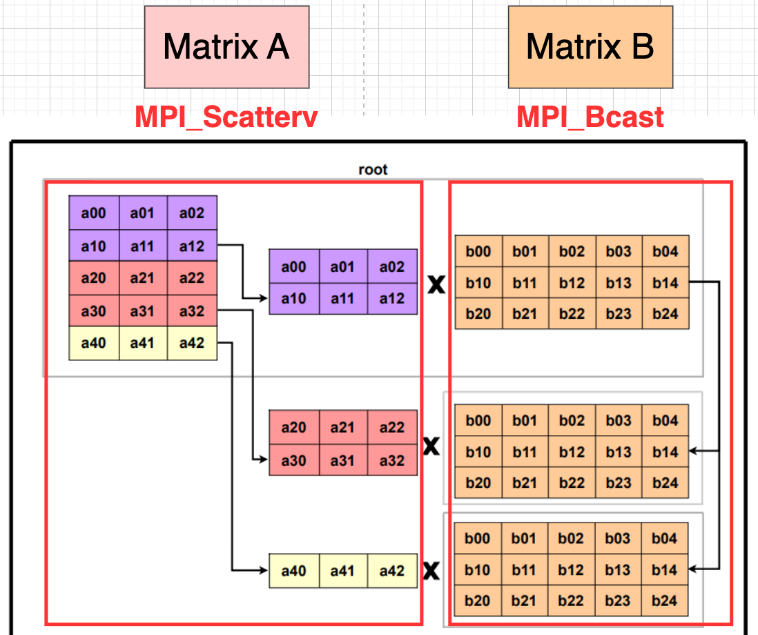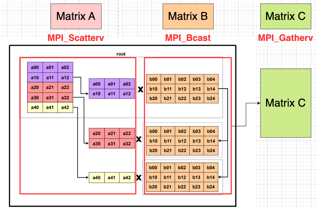 We use MPI_Scatterv to separate matrix A, and use MPI_Bcast to send matrix B to each process.