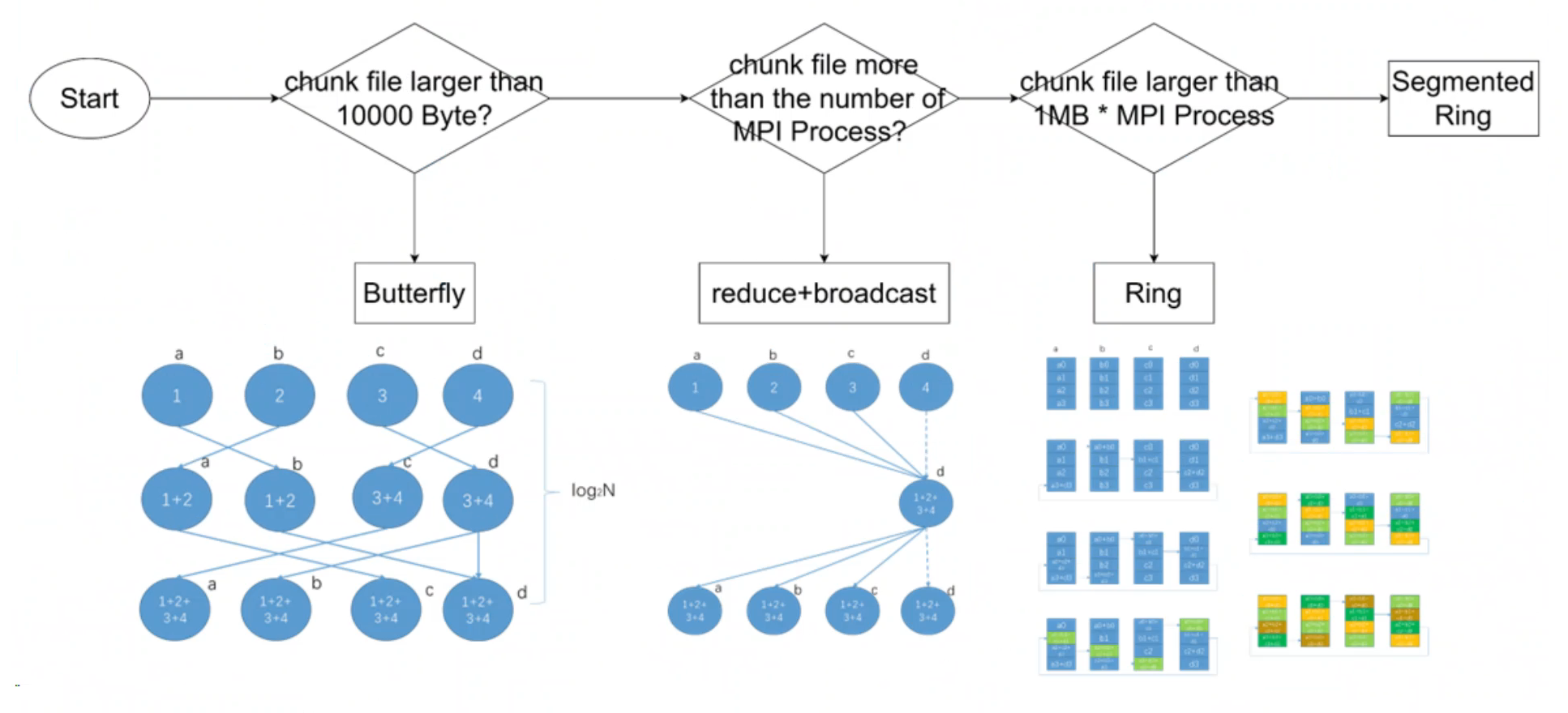 OpenMPI uses different algorithm to do MPI_AllReduce, like butterfly algorithm, reduce+broadcast algorithm, Ring algorithm etc.