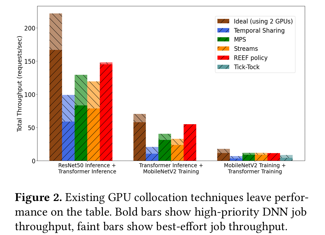 虽然已有很多 GPU 共享技术,但当前的方法还不够细粒度,也没有足够关注干扰问题,无法在 几十微秒(10s of μs)级别上最大化 GPU 利用率并最小化干扰。