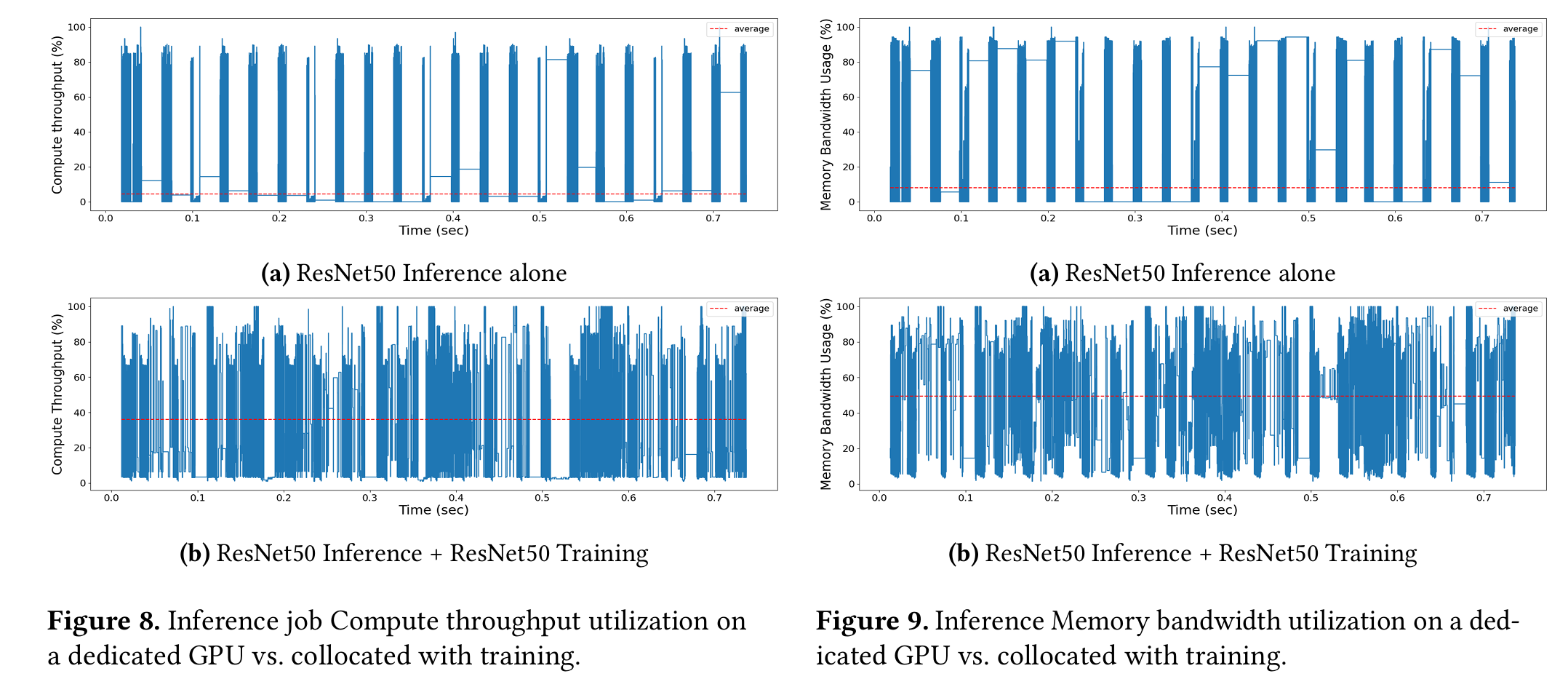 DNN workload consists of many data dependent operators that run for short periods of time (10s 1000s of 𝜇s), each with different compute and memory re quirements. Utilization is bursty and low on average (see red dotted lines) as individual operators saturate compute units or memory bandwidth, but often leave a resource type idle.