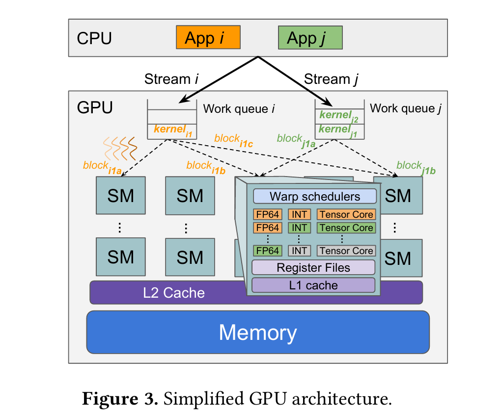 GPU hardware scheduling. As shown in Figure 3, the GPU buffers each CUDA stream’s kernels in a separate work queue onthedevice. Most GPUs,inparticular NVIDIA GPUs, do not allow users to preempt kernels after submission [50]. The GPU hardware scheduler dispatches thread blocks from kernels in each work queue based on stream priority. The scheduler assigns a thread block to an SM when the thread block’s data dependencies are met and an SM with sufficient resources is available. Users cannot control which SM will execute a particular thread block, though researchers have reverse-engineered hardware scheduling policies for popular GPU architectures [30, 45, 46].
