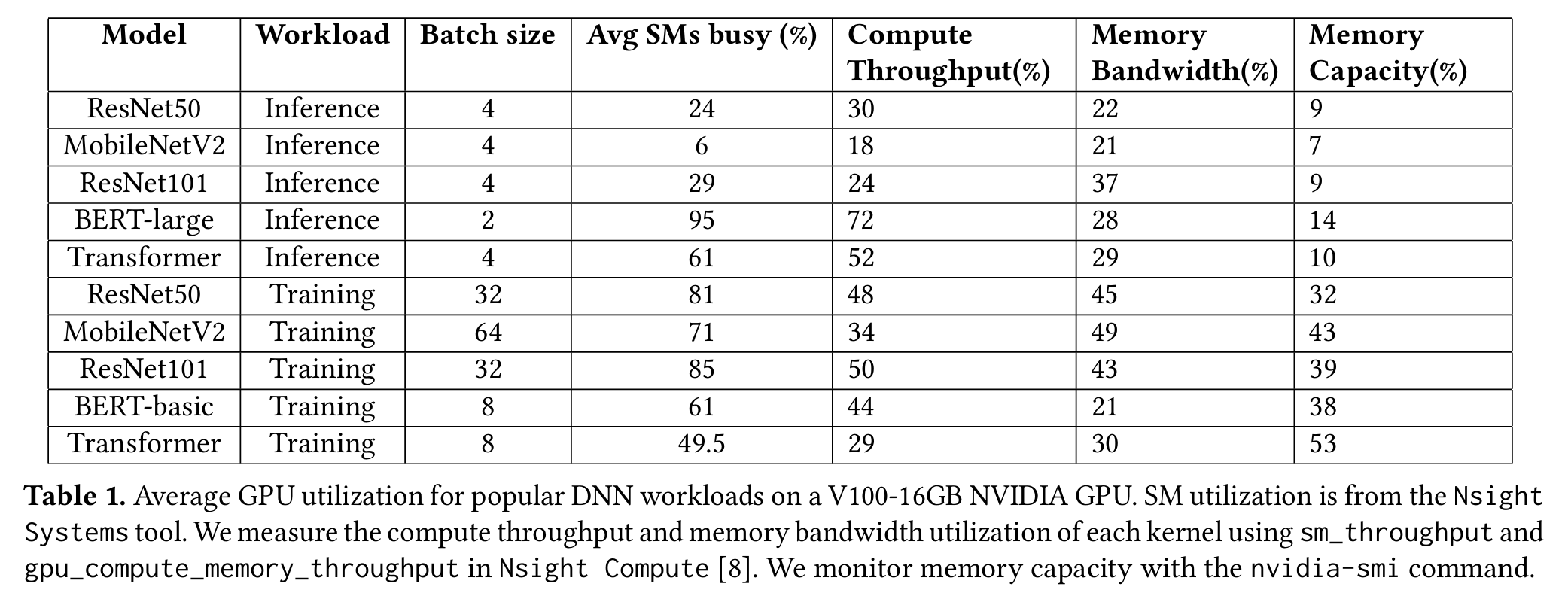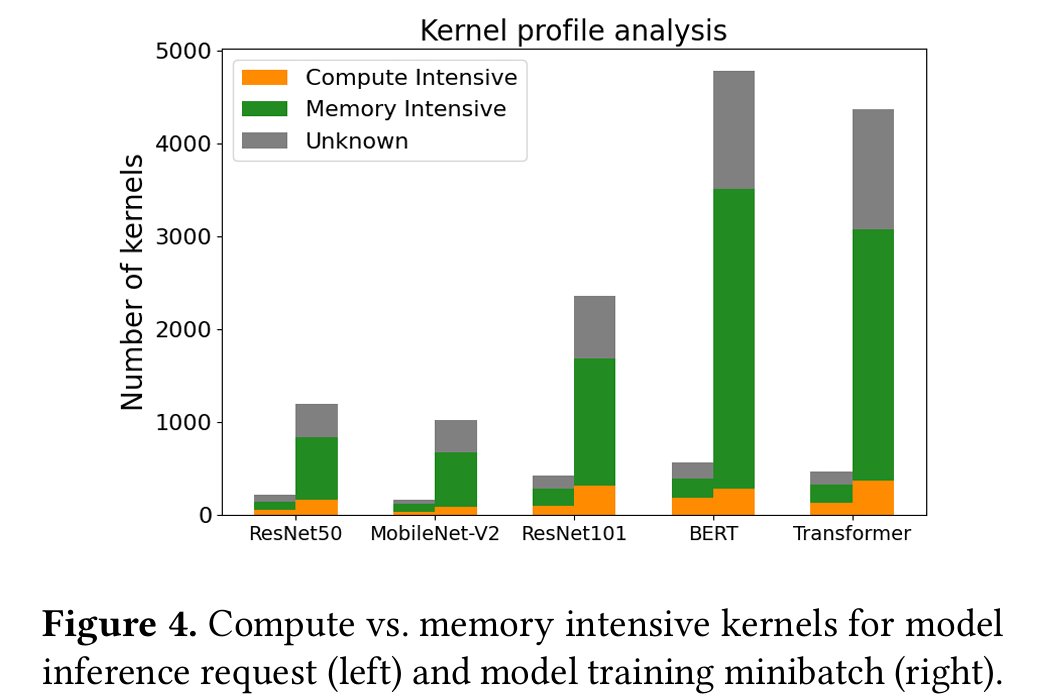 Figure 4 classifies each workload’s kernels as compute-intensive (performance is bounded by GPU compute throughput) or memory-intensive (performance is bounded by GPUmemory bandwidth).4 Kernels typically execute for 10s to 100s of 𝜇s (for inference) or 100s to 1000s of 𝜇s (for training). As kernels from an individual DNN job execute sequentially due to data dependencies, when a kernel satu rates GPU compute or memory bandwidth, it often leaves other GPU resources idle for short periods of time.