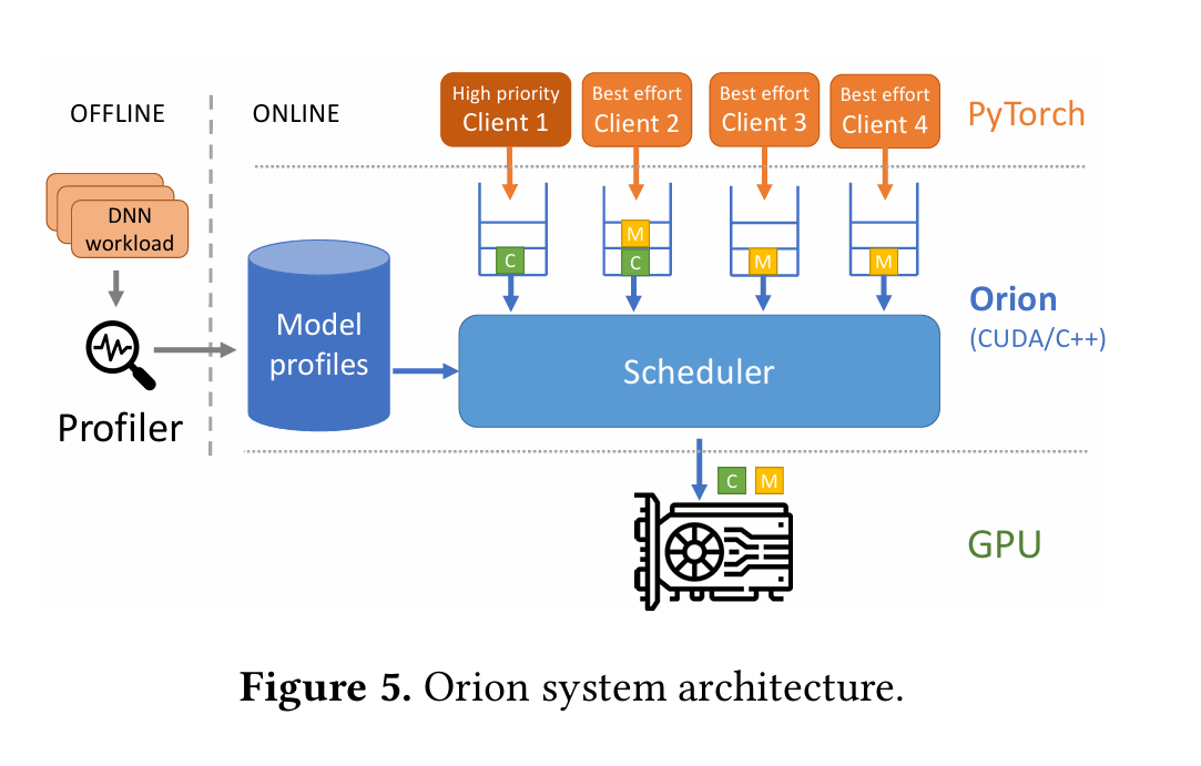 我们提出了 Orion 系统,它能够透明地截获多个客户端共享 GPU 时的 kernel 启动请求。Orion 在 算子级别(operator-level) 调度 GPU 工作,并根据每个算子的计算和内存需求来最小化干扰。我们将 Orion 集成到 PyTorch 中,并在各种 DNN 工作负载共置(collocation)场景中验证了它的优势。